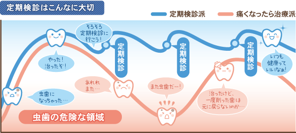 定期的な検診は、虫歯や歯周病の早期発見につながり、結果的に治療費や期間を抑えることにもつながります。